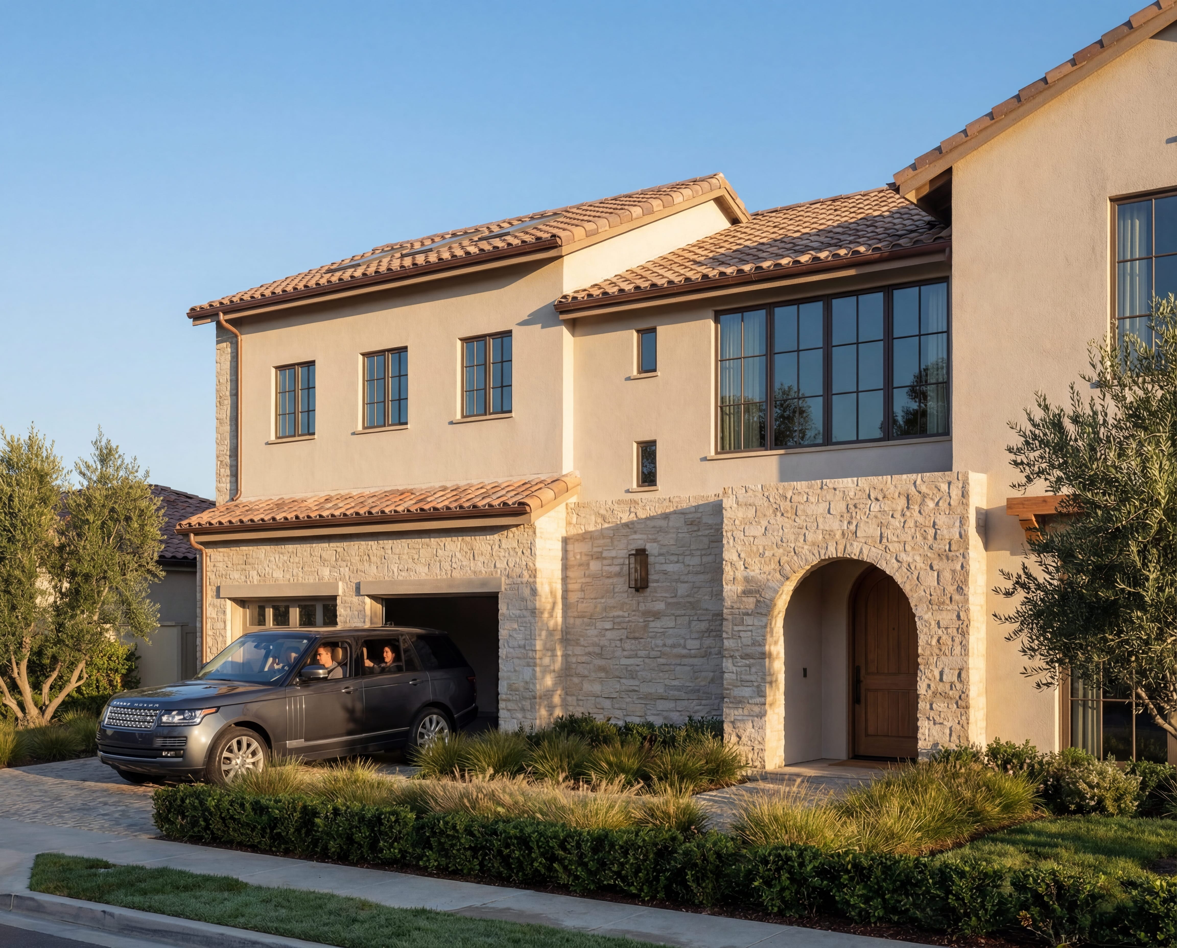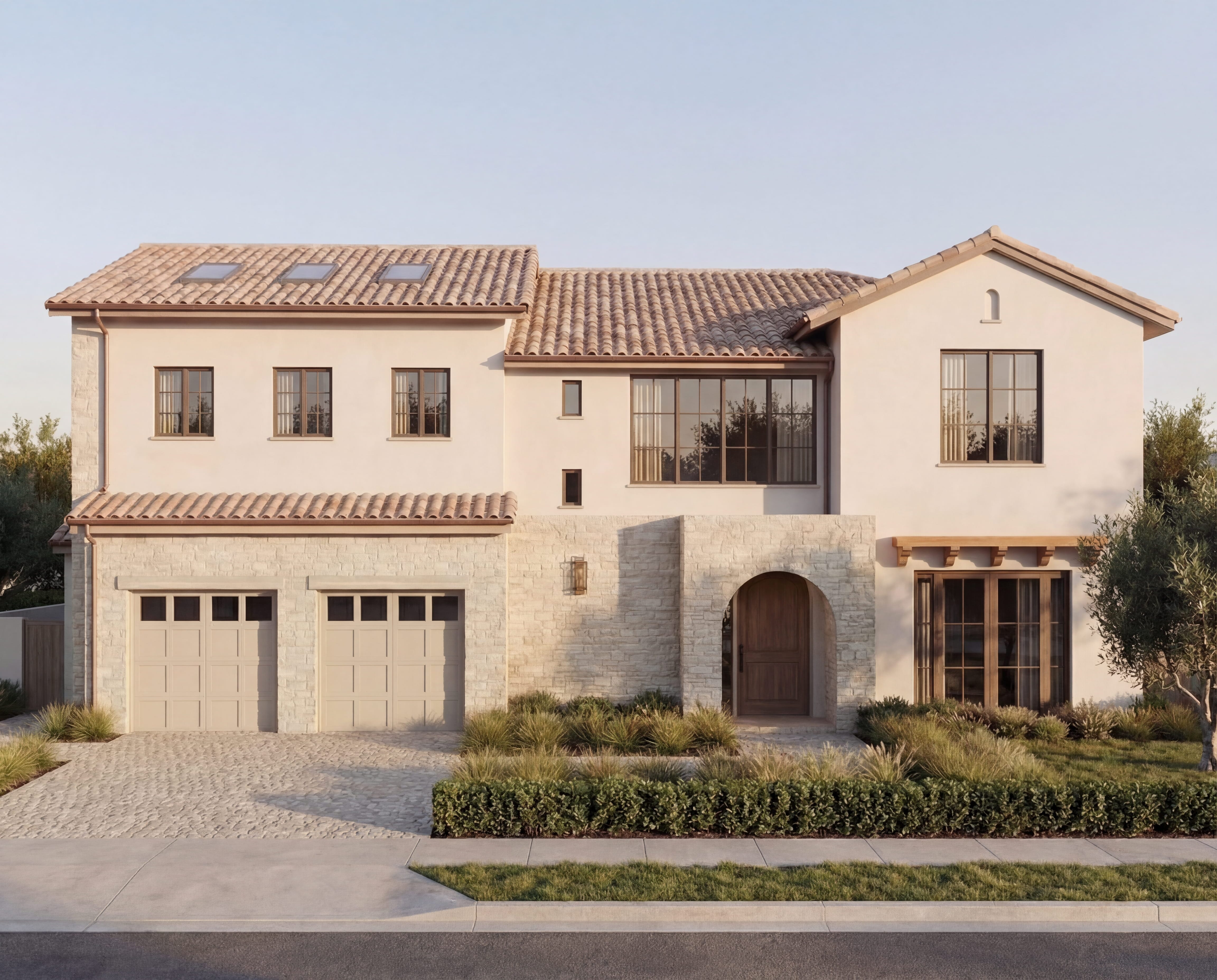 Designed to feel warm, private, and timeless, the home blends soft Mediterranean influence with clean, modern detailing. A cobble driveway, limestone accents, and a layered entry courtyard set the architectural tone, while olive trees, structured hedges, and coastal plantings will shape a landscape that feels both refined and relaxed.