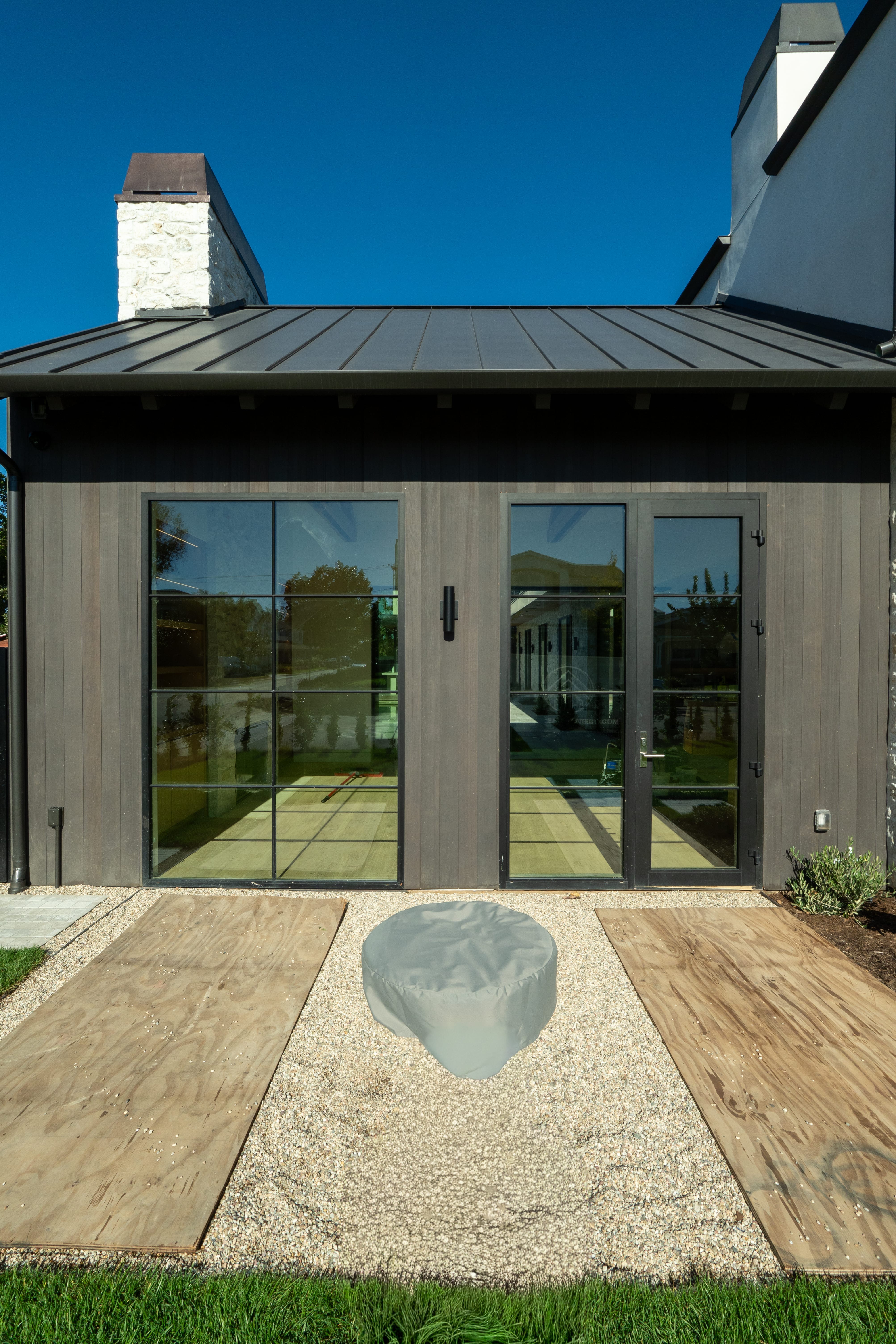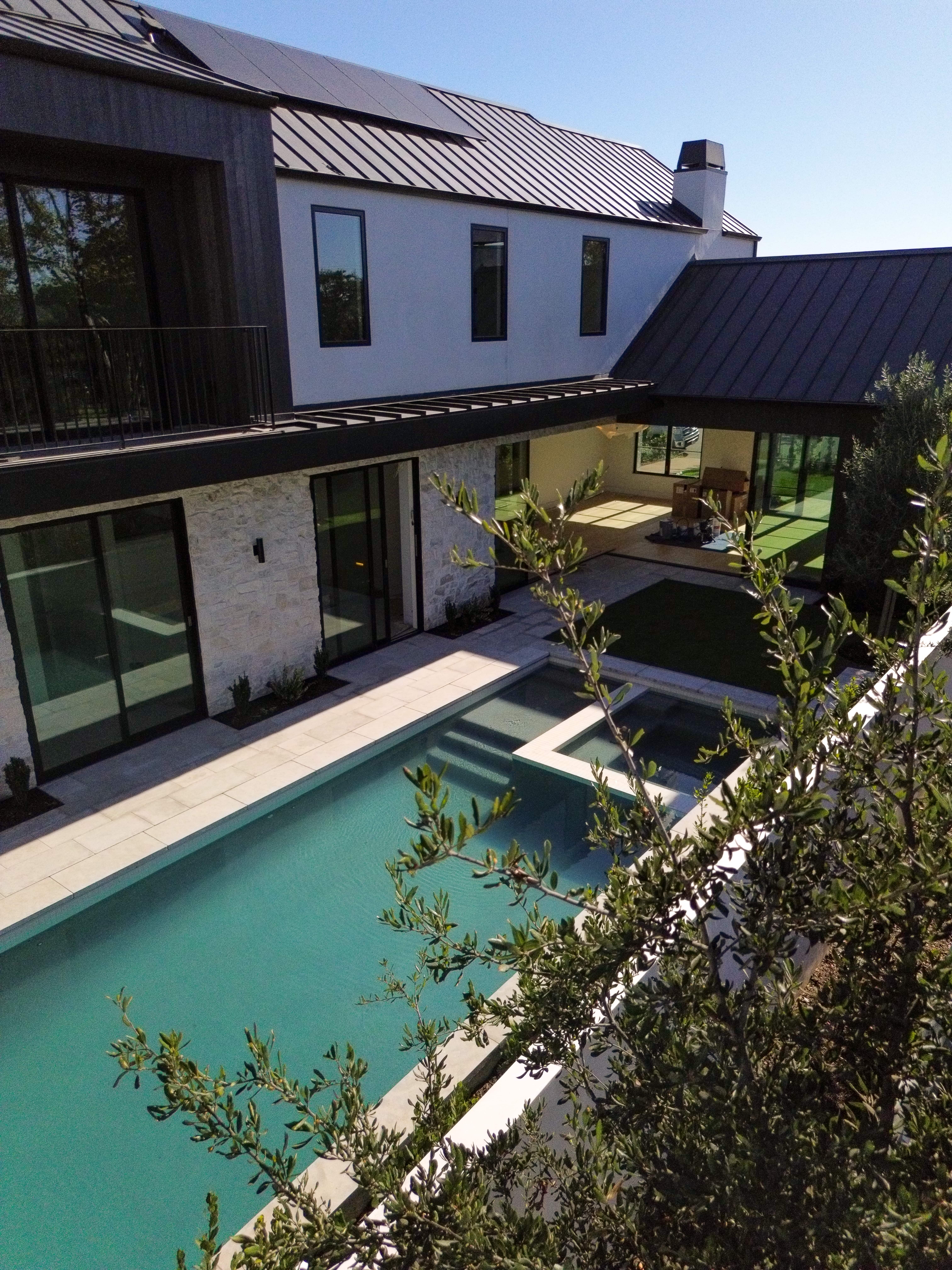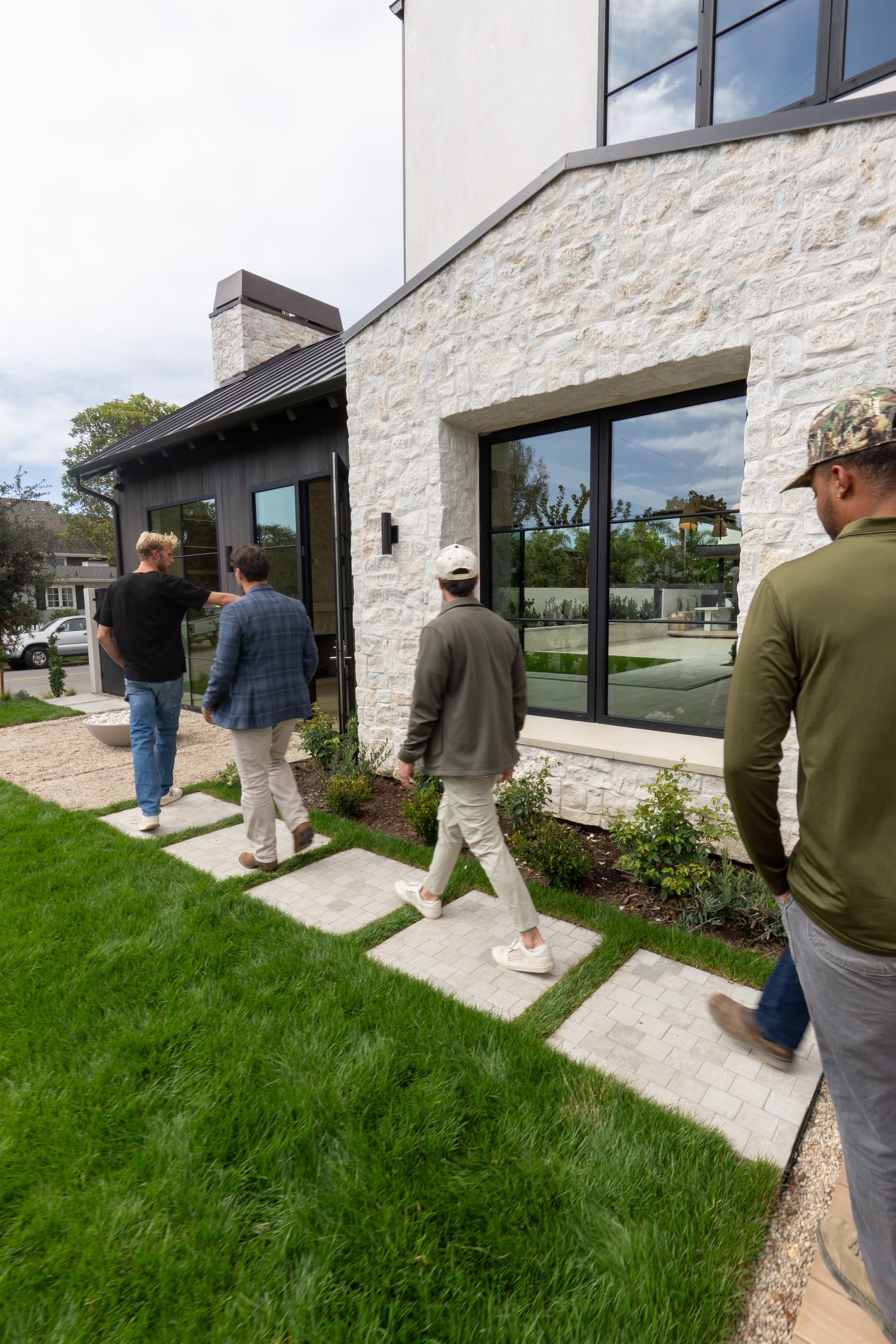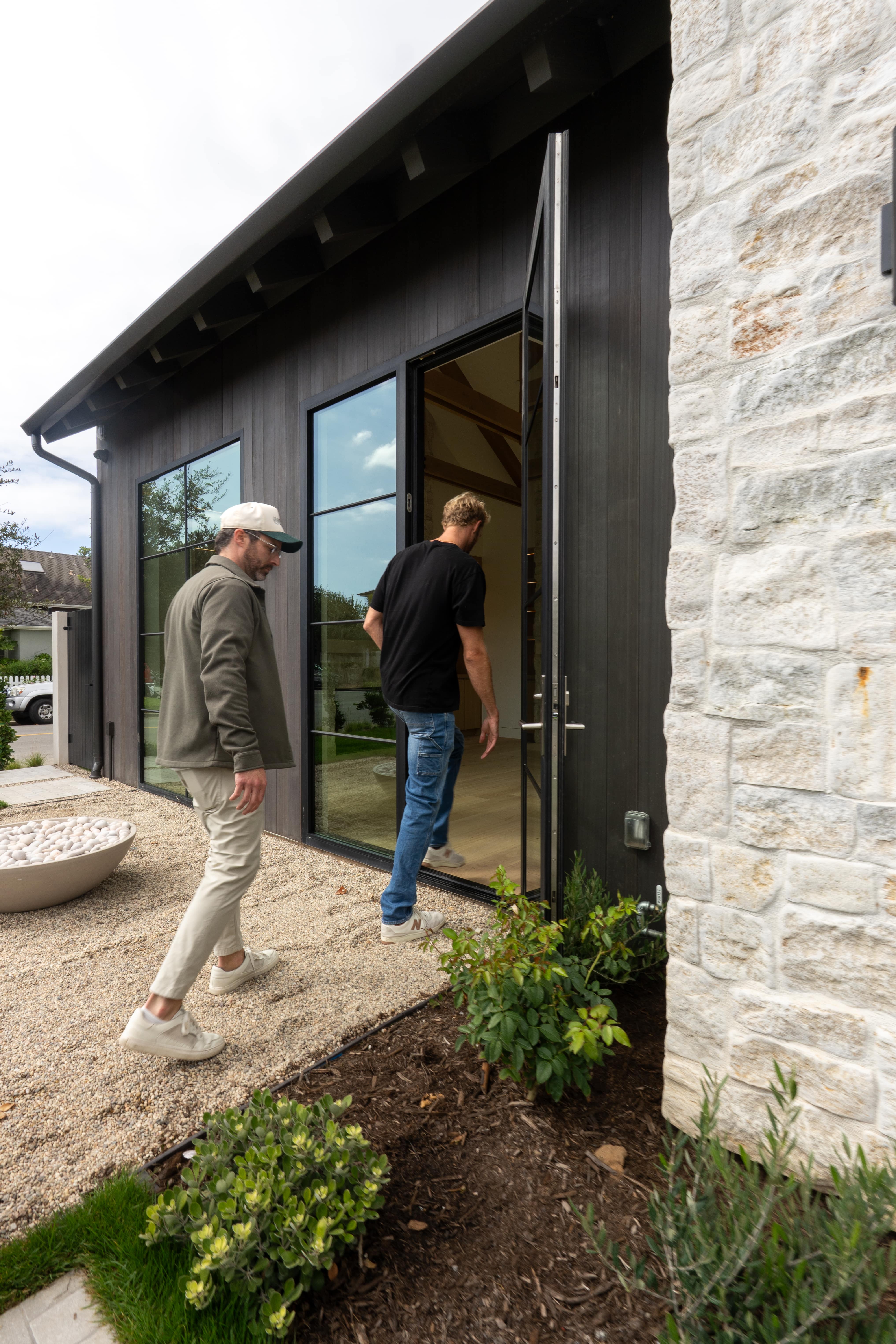 Natural stone, standing-seam metal roofing, and a blend of coastal, traditional, and modern materials give the home its warm yet elevated character. Large black-framed windows, clean rooflines, and expansive indoor–outdoor transitions define the architecture, while thoughtfully layered textures bring a sense of calm and intention to every space.