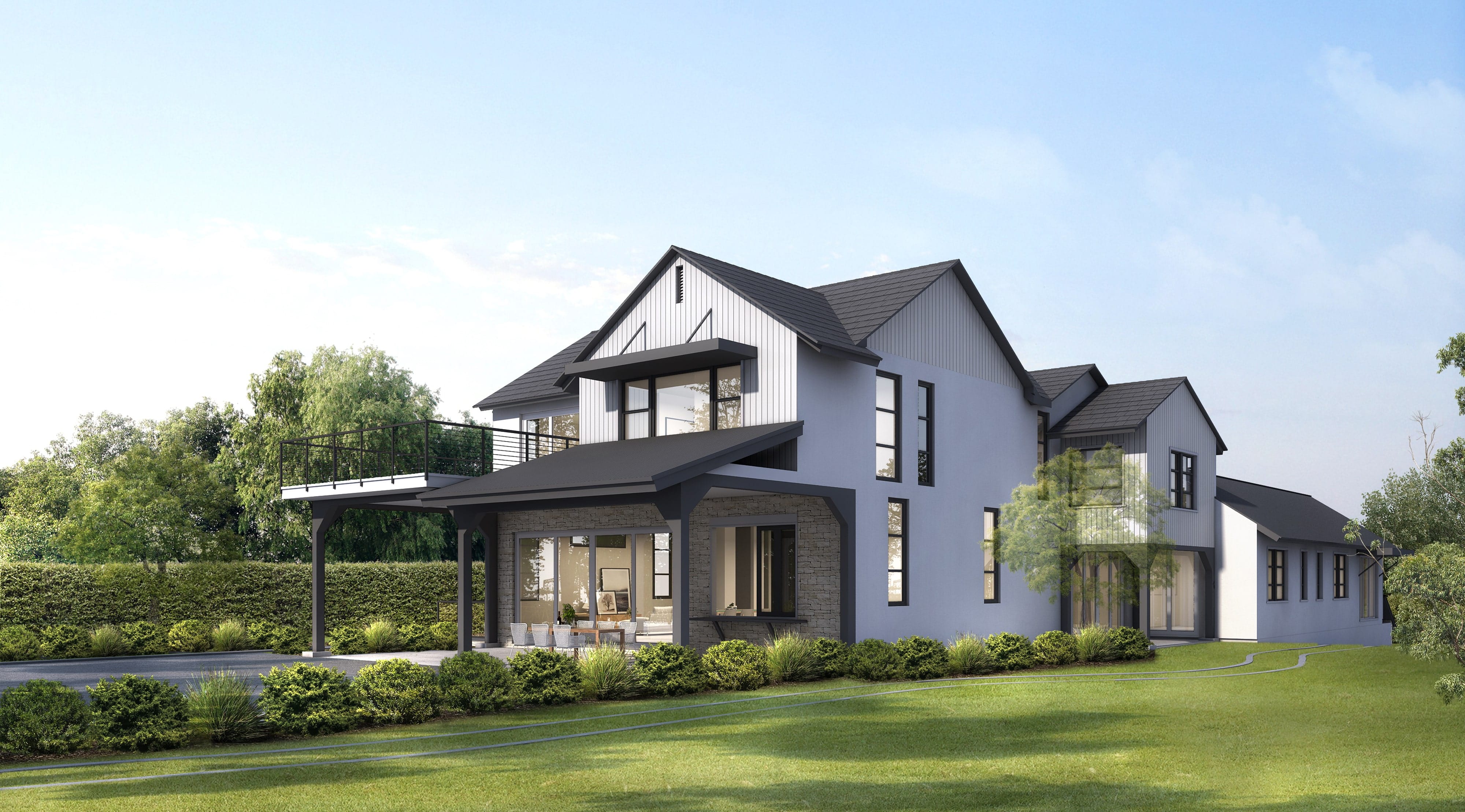 Clad in vertical siding, black metal roofing, and natural stone accents, the exterior pairs a clean, modern farmhouse vocabulary with the rugged character of the canyon. Large rooflines, deep overhangs, and expansive window walls bring in natural light while framing views of the nearby ridgelines.