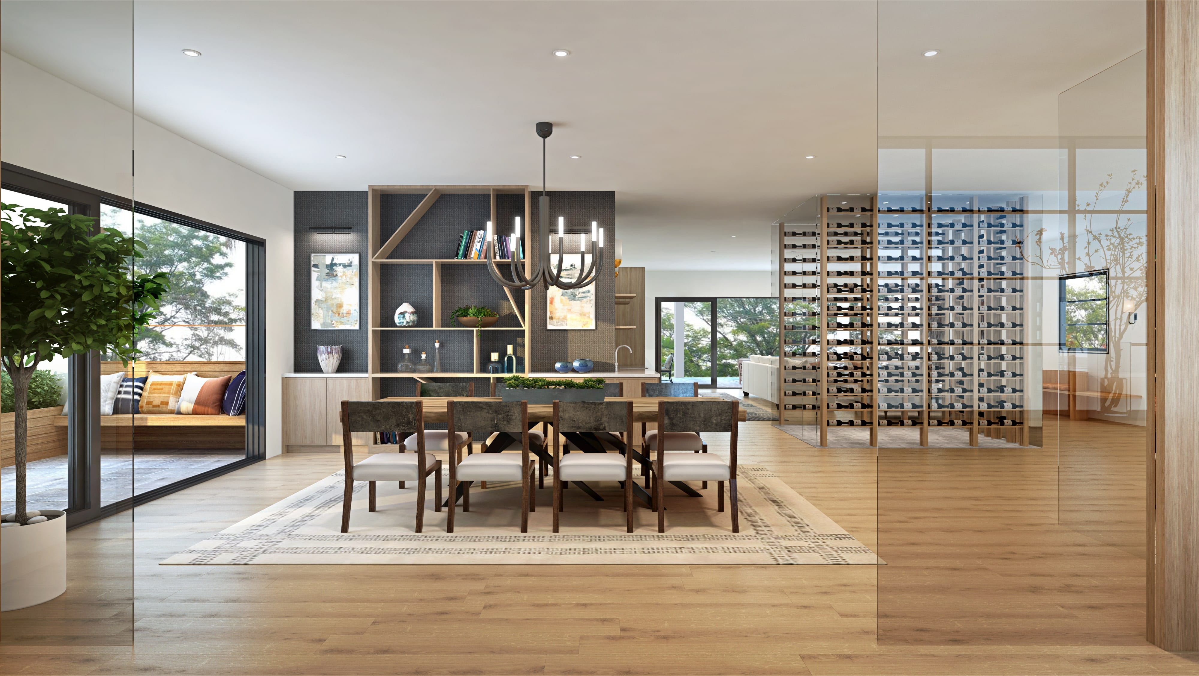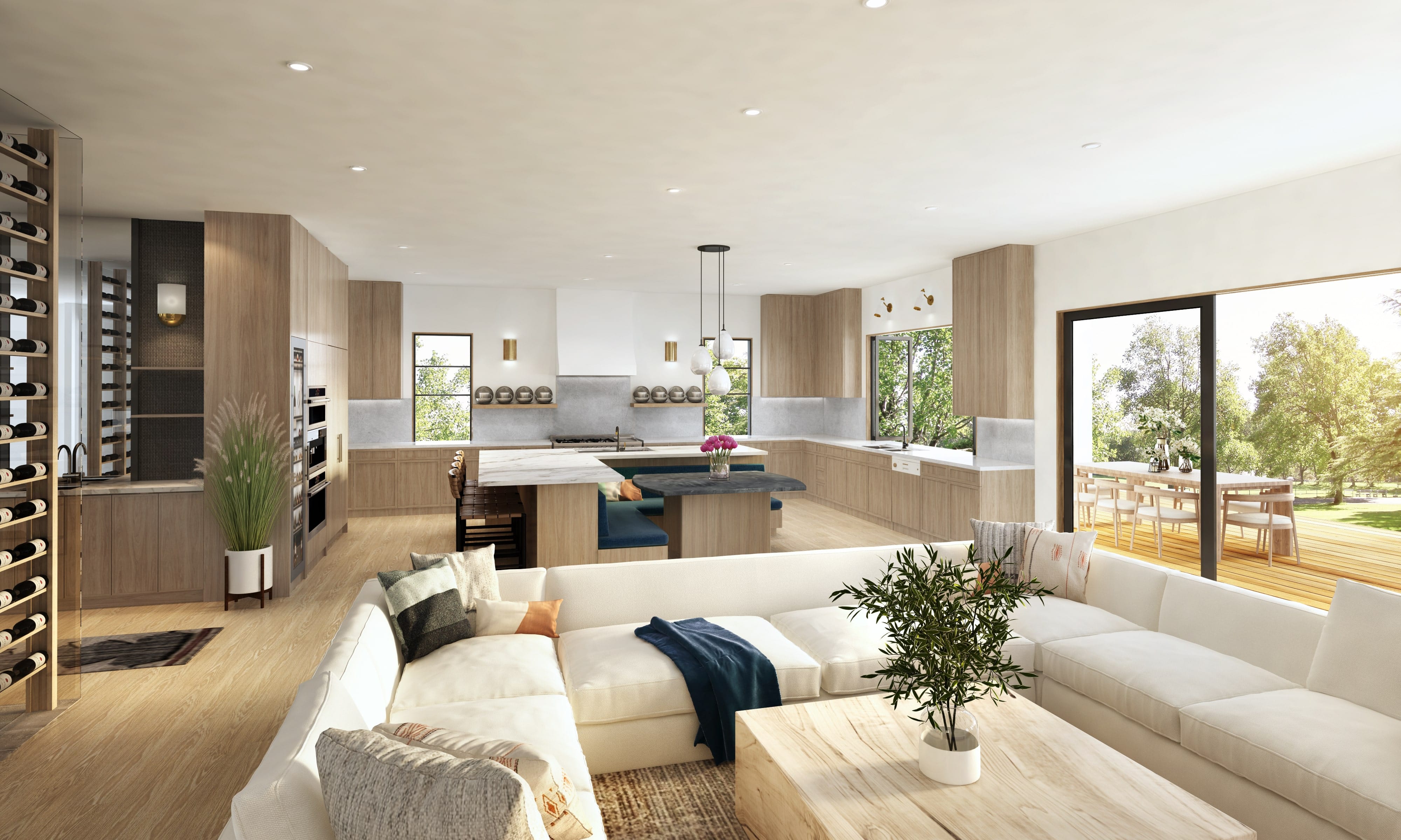 Inside, the layout is built around open, connected living—multiple wings extend from the central volume, creating opportunities for privacy while maintaining a consistent flow throughout the home. The design features generous indoor–outdoor transitions, covered patios, and an elevated deck that overlooks the canyon floor below.